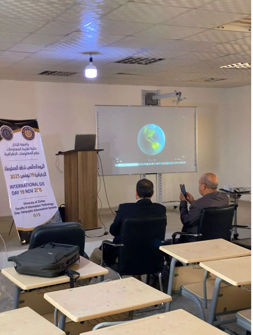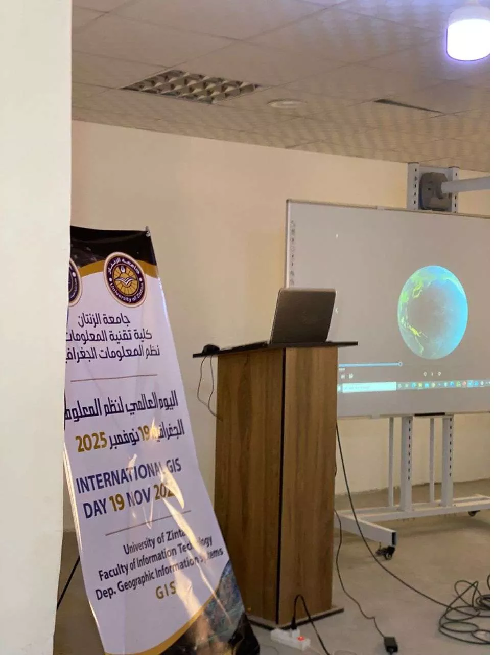 أقيمت يوم الاربعاء الموافق 19-11-2025 بقاعة المحاضرات الرئيسية إحتفالية بمناسبة اليوم العالمي والمحلي لنظم المعلومات الجغرافية. حيث نظم هذه الاحتفالية قسم نظم المعلومات الجغرافية بكلية تقنية المعلومات الجغرافية بكلية تقنية المعلومات وبمشاركة قسم الجغرافيا بكلية التربية بجامعة الزنتان. وحضر هذه الاحتفالية السيد وكيل الشؤون العلمية بالجامعة و وكيل الشؤون العلمية بكلية التربية وأساتذة من الاكاديمية الليبية فرع الزنتان. والقيت العديد من الكلمات التي أكدت على أهمية نظم المعلومات الجغرافية في خدمة المجتمع ومساهمتها في تطويره. وتم تقديم عروض تقديمية للاساتذة المختصين والطلبة,