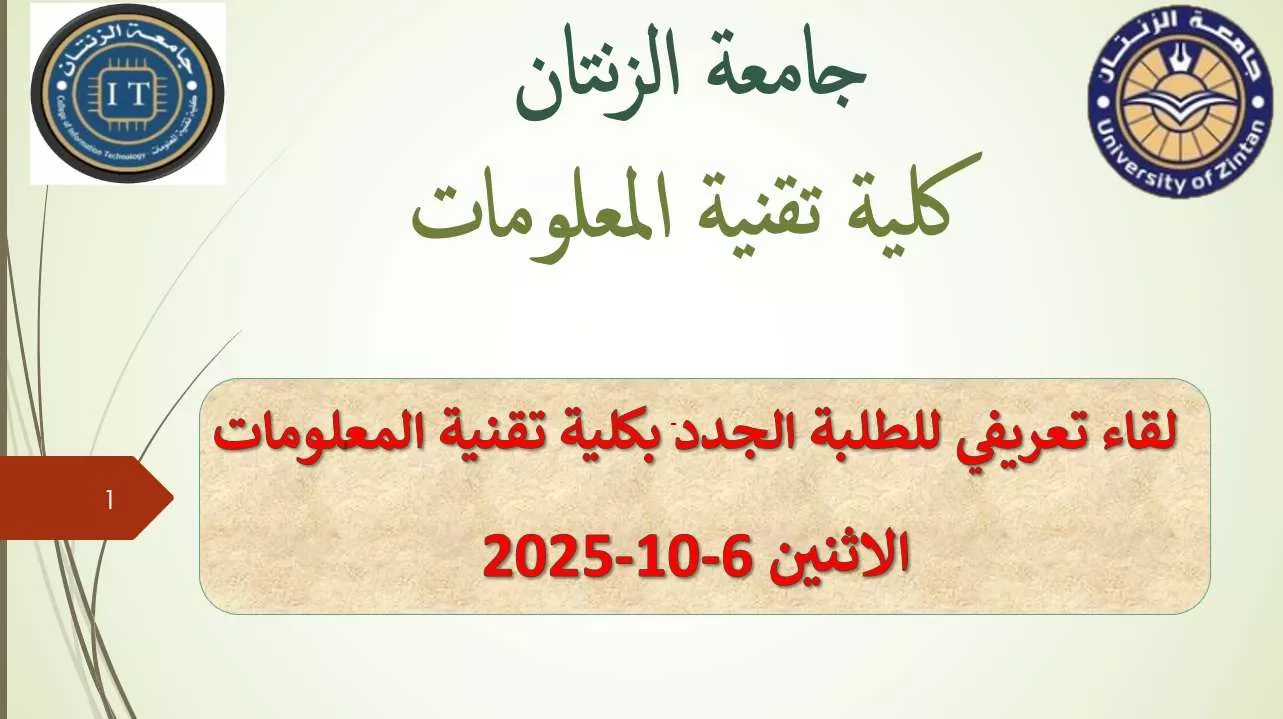 أقيم يوم الاثنين الموافق 6-10-2025 لقاء تعريفي ترحيبي للطلبة الجدد المسجلين بكلية تقنية المعلومات. وكان الهدف من اللقاء الترحيب بالطلبة الجدد وتعريفهم بنظام الدراسة بالكلية والاقسام العلمية المتوفرة حالياً بالكلية والخطط المستقبلية لإستحداث أقسام جديدة بما يتوافق ومتطلبات سوق العمل وخدمة المجتمع ، وكذلك ضرورة التقيد باللوائح والقوانين المعمول بها للدراسة بجامعة الزنتان.